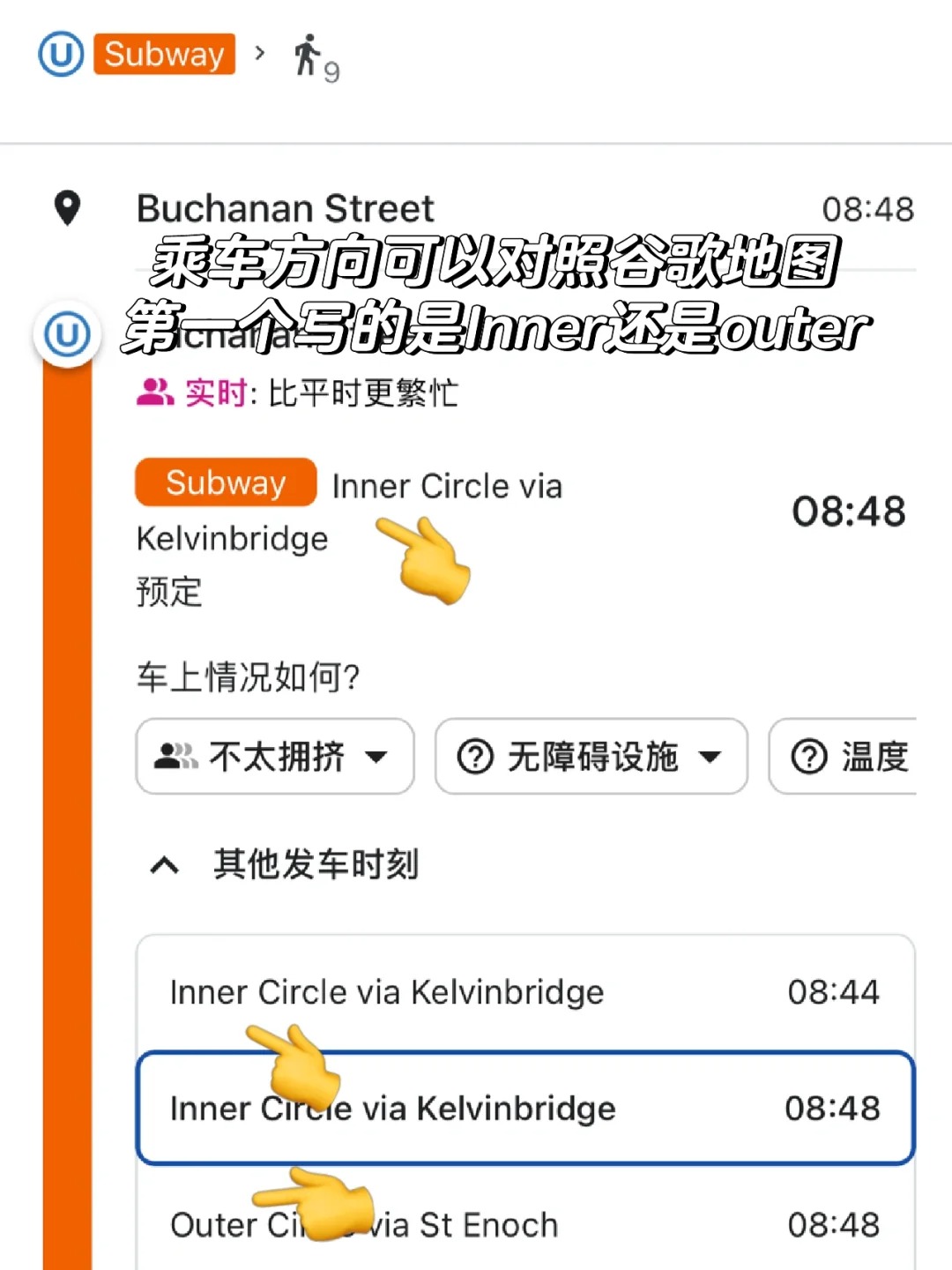 黑色为内环Inner,橙色为外环Outer,站内站牌也是用方向标识,乘车可以参考谷歌地图导航显示的第一个单词