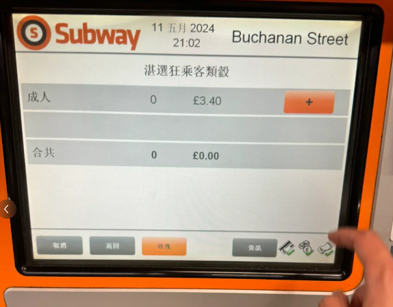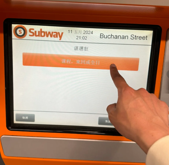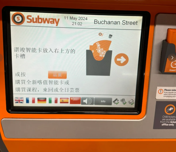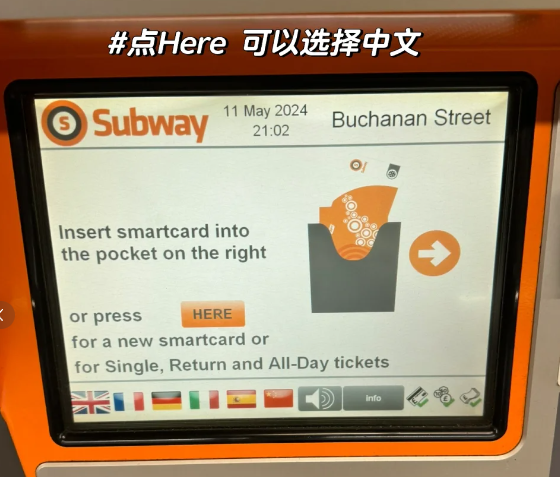 地铁站随便找一个自助售票机,可以选择中文,选择单程/往返/全日,然后刷卡付钱就可以出票了。为防止信用卡杀不出来,最好备一点零钱