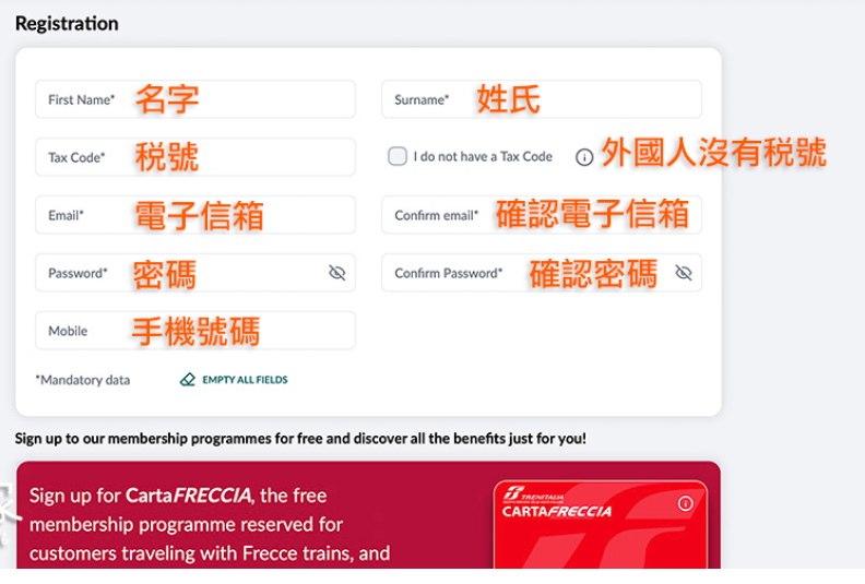 *如果你勾选 I do not have a Tax Code没有税码(例如外国客户),也可以直接在 Trenitalia.com 网站上输入你的地点和出生日期进行註册,但你就不能加入Carta FRECCIA计划,意思就是购票后不能累积高数列车Carta FRECCIA的积分。