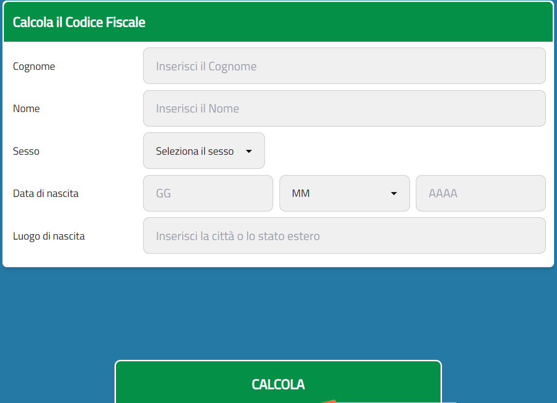 进入 codicefiscale it基本上申请意大利税号很简单,只要分別输入个人的基本资料:姓氏COGNOME、名字NOME、出生日期DATA DI NASCITA (日期Giorno、月份Mese)、性別SESSO (男性Maschile/女性Femminile)、出生地LUOGO DI NASCITA (意大利italia、国外estero),全部都输入好之后接著按CALCOLA,最后就会出现16码由英文大写字母和数字组合而成的税号!