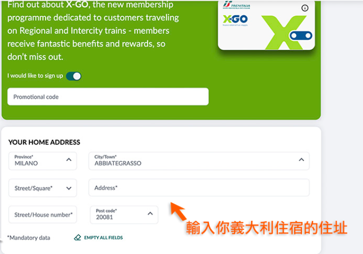 专为乘坐区域和城际列车旅行的客户而设,让你可以积累积分,这些积分可以在你下一次旅程中折扣车票的费用。输入你在意大利住宿饭店或Airbnb的地址即可。