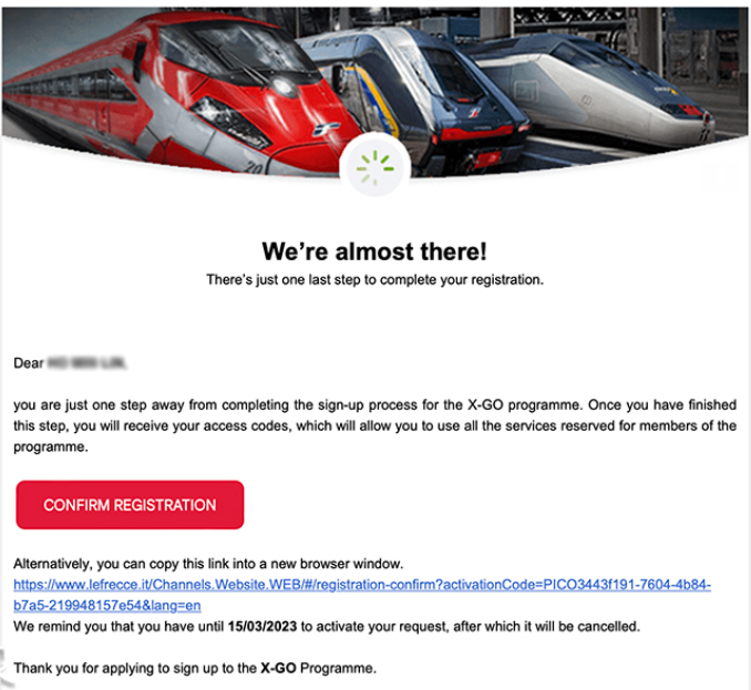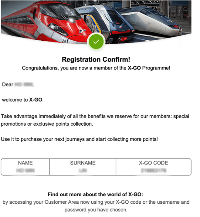 6. 完成认证后,会在收到一封註册確认信,完成认证后,很 快就会收到一封意大利国铁Trenitalia的会员註册確认信,里面会提供使用名称、一组会员卡號以及Carta FRECCIA和X-GO两组QR Code可以下载,如果没有输入Tax Code税號,所以最后只有收到X-GO的会员卡号和QR Code。之后有在进入官网点选加入Carta FRECCIA忠诚度计划,就有在收到Carta FRECCIA的会员卡