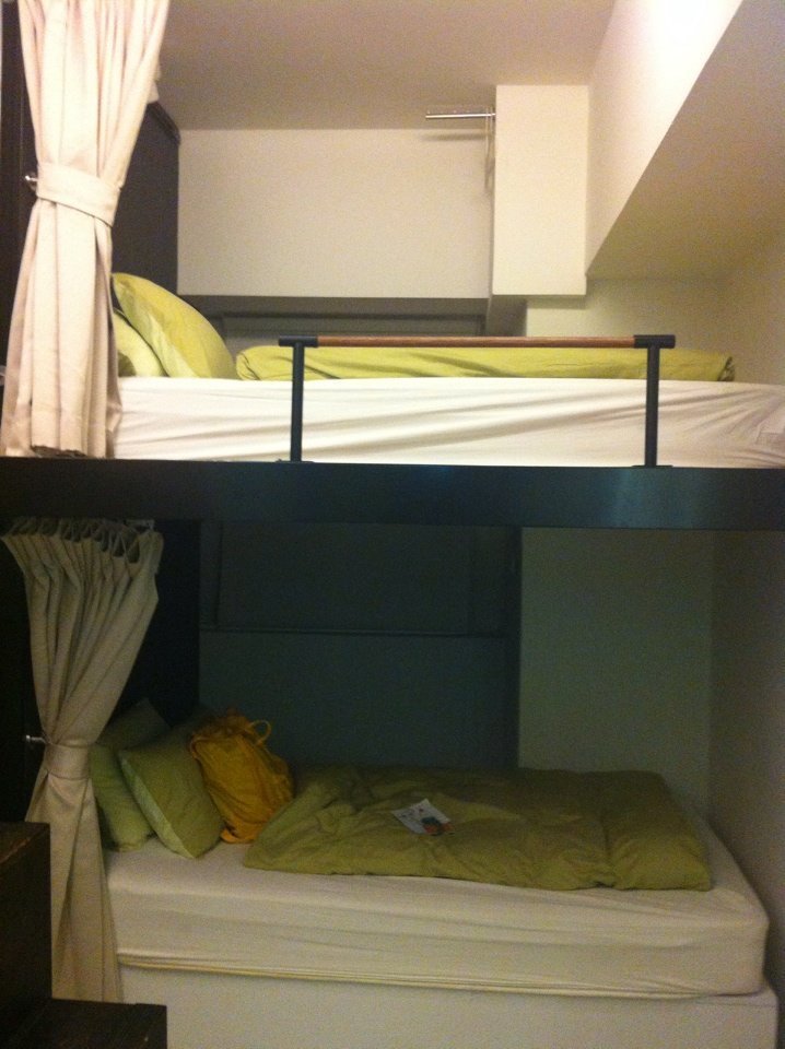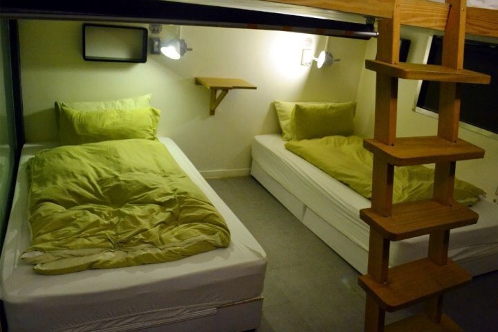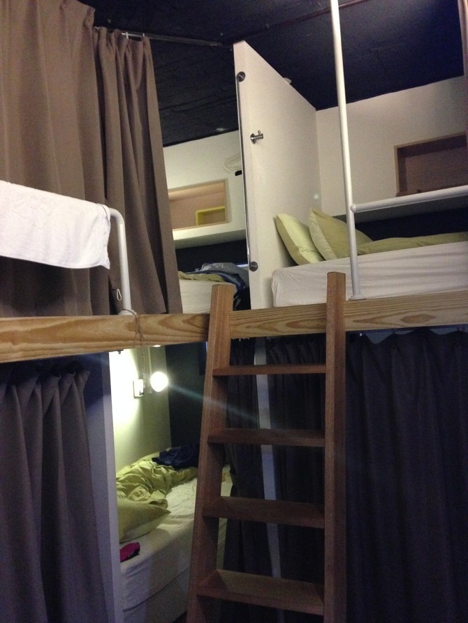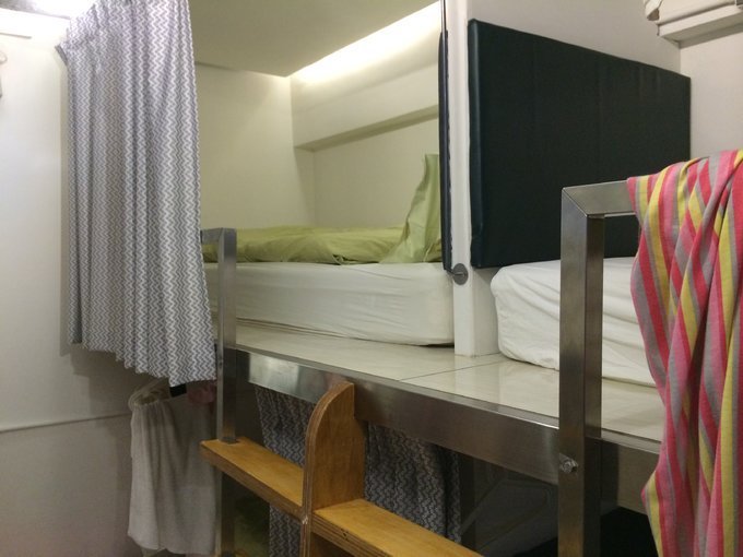 偷张booking.com上的照片,我第一晚住的6人间就是这一间。右边白色的都是储物柜。现在床边还有咖啡色的厚布帘子可以拉起来,私密性和遮光性都有保证。第二晚改住公共浴室的大床间,感觉也不错。
