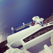 一个网友关于Imerovigli镇上父子两开的一家名为Prekas apartment的酒店的描述吸引了我们的关注。首先是他认为Fira和Oia商业发达,游人如织,不像Imerovigli那般安静,适合居住,让我们深以为然;然后是老板父子俩非常nice,给他提供了很多帮助,而且完全没有商人唯利是图的感觉,让人身心愉快;再者是价格很实惠,而且有2间卧室的套房,很适合我们两对couple居住;这个网友还留了酒店的网址和老板儿子的email,说直接跟他联系价格上比网站上预订还可以便宜。在打开酒店网址的一刹那,我的呼吸都要停止了,景色实在是太美了!在网站上浏览了一圈,很快就决定非他莫属了。于是给老板儿子发邮件联系,来来往往了近10封邮件,从了解情况、报价、确定预订、付款到接机安排就全敲定了。从邮件中就可以感受到他的热情周到和耐心,更坚定了这个选择。 老板儿子确实很nice,当时我说住五晚,他才给了我一个很高的discount,价格敲定后我又改为三晚,他只字未提,我自己都有些不好意思。最终价格是每晚140欧(不可撤销),合一家才70欧,这可是在欧洲,带私人露台、厨房、客厅、泳池的无敌海景套房呀,真是相当的便宜。而且这个“不可撤销”的预订老板儿子给我保留了很长时间,一直到签证拿到手,我才确认付款。“我家”在酒店的最上面,拥有无敌海景(火山岛)的超大露台