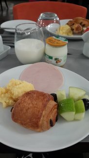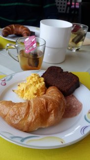 温馨的湖畔酒店了,大家看我的图片吧。 分享:根据我这次的经验,大家在欧洲还是尽量预订含早餐的酒店,或者房价不含早餐,也可以另外付费在酒店吃早餐。早餐通常有各种法棍,可颂,牛奶,果汁,水果,果酱,酸奶,奶酪,香肠,培根,鸡蛋,咖啡,茶。 一顿丰富的早餐是非常重要的,本来旅行在外无论是体力,精力都消耗大,如果饿着肚子出门,心情也好不了。早餐的收费一般在11~20之间。如果是自己在外面买了吃,一份很简单的可颂加咖啡也要10几欧。或者你想从超市买了吃,但是一大早哪里去找加热的地方,而且欧洲的酒店里常常不配备开水壶。当然如果全程预订公寓式酒店,带厨房设备的,那就另说了。