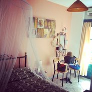 圣托里尼选择的旅店是Danae Villa (达娜厄别墅),一是觉得这家价格便宜,有机场的免费接送,另外,从地图上看,这里不在小镇中,但是离小镇又不远,可以保持安静的环境,又能随时去小镇游逛。后来发现失策的是,从旅店到小镇走路十五分钟左右,但是是上坡路,这个跟走平路可是天壤之别。30度的天气走上坡路,可是需要一定的体力。发现这个缺点后,我们俩决定每天出去就尽量不回来,回来就尽量不出去。酒店很干净。还有游泳池,偏安于一隅,其实旅店还算不错。老板礼貌热情。唯一缺点就是去镇子稍显费劲。