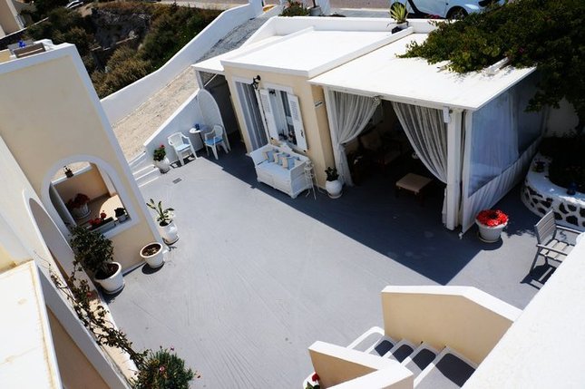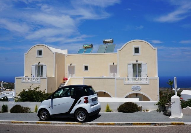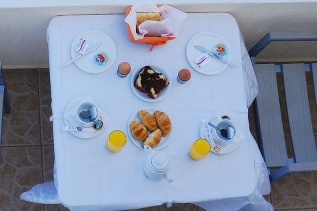 船到码头后,耀眼的太阳和与淡季不一样的熙熙攘攘的人群让我一时有点犯晕。不过,好在很快找到了local bus,问了一下,直接坐上了去OIA的车。因为我们的民宿在OIA小镇附近,而且下了车就是民宿,不用拖着箱子乱走。这也是我订酒店的时候就考虑到的。毕竟,母女俩还是省点体力用在逛景点上吧。民宿的主人很热情,房间也是相当不错的,特别是阳台,是整个行程中最得我麻麻欢心的一个。第二天早晨,坐在阳台上吃地中海早餐,有橙汁、红茶、羊角面包、切片面包、蛋糕和鸡蛋。