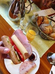 我们入住的Wildbad Rothenburg 酒店,罗腾堡这个地方已经很少游记有提及,这个近年才从19世纪疗养院改建的酒店就更无人提及了,在booking里也没有评论、没有中文介绍,官网纯德文,不过古堡配图、房间图片、有舞台布幕的豪华宴会大厅让我着迷了,再就是不用97欧超吸引的价格,一直梦想着住上一晚古堡酒店的PINA毫不犹豫订了! Wildbad酒店就在罗腾堡南城门边, 偌大的建筑,依山而建,我们绕了一圈找不到入口,后来终于找到了廖廖两个工作人员,他们很热心的带领我们来到了4楼的接待处,所谓的正门入口原来的第四层,太诡异了!前台美女MM非常热情地向我们介绍酒店的作息时间、注意事项等,还详细地介绍了这个大古堡各个出入口的位置和开门时间,最后还补上一句”i really hope U will find the entry at night"弄得我们不得不在去逛小镇前先绕场一周走遍整个酒店熟悉地形~ MM领着我们拐弯抹角到了电梯处,我问了下”这个酒店很大啊很漂亮啊是古代的城堡吗?“她很坦白用英语回答“不是,这是一个19世纪的医院、疗养院改建的酒店,很多人在这里结束他们的生命“,oh!难怪这么便宜!离小镇这么近却叫wildbad,如此舒适的环境却是小旅馆的价格,我就这样照着MM的原话翻译给阿J听,害他晚上进来后用竞走的速度飞奔回房间,锁好门还要double check,triple check一下!呵呵~~ Booking.com官网订的罗腾堡古堡酒店Wildbad hotel,除了图片,很少介绍,也没告知包早,来了才知道含双早,虽然wifi收费3欧(后来没收),也非常划算!如果受得了晚上有点....寂静得可怕的气氛,还是非常推荐!其实我看好多游记其他穷游儿们住古堡晚上都会有这种气氛的~~~ 我们来到餐厅,竟然包场!Err....昨天看停车场里明明是停满车的呀......可能我们太晚起床而已......想太多了~~~!据前台美MM介绍早餐是地道的德式早餐,在经典木质结构配水晶吊灯餐厅里享用,窗外是古堡一角,葱郁的树林,小鸟在歌唱,充满嚼头的德国面包,可爱的蛋托,咖啡奶茶、各式切片火腿、各式切片芝士、水果、果汁、甜品等等,还有穿着传统德国餐厅侍应服装的MM服务!太棒了!在德国这几天酒店都含早,我们起得晚,早餐都很好吃、尽量多吃,中午甚至晚上那顿就凑合着~能省则省~~