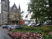 这次我们选择了离火车站较近的一家四星级的酒店,叫因特拉肯酒店。酒店大堂极有当地特色。 酒店后面有一教堂,入住后才发现房间的窗户对着教堂,教堂全天候整点,半点报时。我们整晚在钟声中入睡。说不吵那是假的。清晨起来去看个究竟,发现这教堂还是挺漂亮的。外墙是用石头砌的。