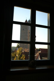 酒店位于堡的西侧,靠近城堡城门Burgtor。酒店迎宾的是一位胖大婶,笑容和蔼,丝毫没有因为我结结巴巴、语病百出的英语——估计我的历任英语老师都会翻脸不认我的这个学生——而着恼。原本Booking上写的是要停在收费的公共停车场上,胖大婶指着酒店行人道上的一个空位说停这儿免费。拿了钥匙,开了房间,顿时觉得应该在这儿多住两天。铜质的钥匙座、原木的大床、久已不见的蚊帐,凡此种种,都有些家的感觉。一侧的窗户正对着Burgtor的钟楼,又多了一些异域的味道。 PS:Hotel Klosterstüble在Booking上的评分是9分,在罗滕堡的酒店中排名第8,算是物有所值的酒店。
