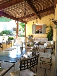 Le Mas Destonge是位于鲁西永的一家民宿,周围都是葡萄园,我叫它法国农家乐。跟着导航到了民宿所在的小村子,天色已晚,没什么人,突然一个和蔼的老头儿冒出来招呼我们,示意我们把车停到门口,我们以为这是一个普通的村民,后来才知道这就是Le Mas Destonge的老板,非常朴素,明显比网站上的照片老了许多。而Le Mas Destonge真正做主的应该是老板娘,目测老两口年龄至少超过六十了,老头英文不太好,非常随和,笑容可掬,老太太精神干练,一看就是个很精明的女人,英文很熟练,虽然也非常和蔼可亲,但更显得气场十足。在我们之前已经有其他客人入住了,一大家子,祖孙三代五六口人,还有一对10岁的双胞胎女孩儿,就在院子里坐着聊天,看见我们来了也热情地跟我们打招呼,感觉非常温馨。 民宿在院子里用早餐,早餐是自助的,有各种面包、果酱和水果,老板问我们要牛奶还是果汁,我们要了果汁,后面几天在我们的餐桌上就直接准备好了果汁。