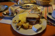 在预定的时候,特地要了高层的房间,想着能够看到新天鹅堡,可没想到给的房间是背对城堡的。好吧,我们每天早出晚归也没时间欣赏啦。下次预定的时候一定要注明是能够看到天鹅堡的房间。房间很小,浴室也很小,两个人把行李打开就基本没路了。楼梯口有热水壶可以烧热水呢。早餐没有吕德斯海姆的丰盛,但也很OK,奶制品依旧是我们的最爱。