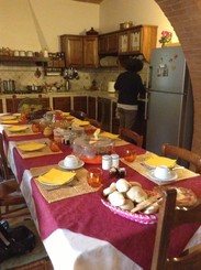 这个农庄TOMTOM也导航不到,只能和老板娘约在某个地方碰头,然后她开车在前,我们跟在后面;到农庄的路是很老的乡村小路,连TOMTOM都没有覆盖到。而这正是我们希望的,能够有机会到托斯卡纳的农家体验一把。很快就开到了,下了车,我们三个恨不得能欢呼起来:太喜欢了!看图不解释。 女主人Maura和老公两个人经营着这个农庄,Maura能讲英语,人也很能干,老公只是给她当副手。之前看酒店介绍后我们很渴望能够晚上在她这里吃一顿她们自己烧的,取材于农庄本身的晚餐,可惜她很抱歉地告诉我们最近太忙了,没时间准备,推荐了我们一家位于蒙特尔奇诺的餐厅,号称T骨牛排特别棒。 转天Maura早就准备好了早餐, 满满地摆了一桌;夫妻两个和我们一起吃.Maura家的面包是这一路吃的最好吃的面包,刚刚烤出来,又香又软. 我们还在餐桌上进行了中意两国的民间交流 . 他们问我们来自哪个城市,做什么的, 据他俩说这里中国人来的很少,之前只来过一次香港人.而他们也从没有去过中国. 我们大赞意大利及托斯卡纳的美丽, 但他们说这还不是最好的季节:五六月份时绿草青青,遍地鲜花;九十月份葡萄成熟,遍地金黄;说得我决定将来的某一天一定要再来一次.同时我们也建议他们去看看风格完全两样的中国 . PS: 他们家好几只喵星人很有趣, 那只名叫施皮茨的黑猫很粘人, 我们起床时就跟到卧室,还爬上床,吃饭时又跟到餐厅. 等我们吃完饭在院子里遛弯时他老兄又来了. 还纠集了几只黄喵.