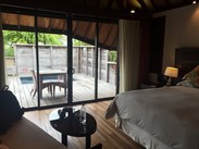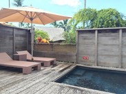 Hilton Moorea Lagoon Resort & Spa.在Trip advisor上看是Moorea排名第一的酒店(Moorea没有被开发的很厉害,所以岛上的酒店也不多)整个酒店感觉不大,不高级但是还算温馨舒适,酒店的工作人员都很友好..此时此刻我对这个酒店的评价虽然一般,是因为有了之后Bora Bora的比较,但刚到的时候还是觉得非常不错的。 到的太早,由于下午2点才能check-in,我们只能在resort里面闲逛.这个酒店真的不大,可逛的不多,餐厅也没几家,好在景色不错,捏了几张照片.因为长途劳顿,到了中午我们真的是又饿又困.酒店不是all inclusive的,所以午餐和晚餐要自理,我们就随便找了个bar点些东西充饥. 食物真的是本次旅程唯一减分的东西,种类少价格贵,想说随便吃点儿,点个破鱼肉汉堡就二十多美金,味道就更别提了..我们选的房型是Garden Pool Bungalow,自带一个巨小对角线和我伸直了差不多长的泳池。在定之前看攻略说水屋(Overwater Villa)直接去Bora Bora感受就好了,在Moorea可以体验一下花园房顺便省一下钱。后来发现Hilton的水屋真的是超级小,没住也不亏. 房间总体来说还可以,干净宽敞,关键是空调够凉!我们简单收拾了一下就到小院儿泳池玩耍去了。对于胖子这种游泳初级者来说这个游泳池也够他扑腾一下了,但对我来说想蝶两下胳膊都伸不开