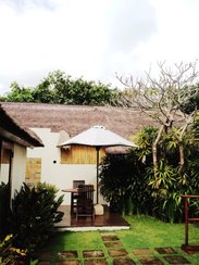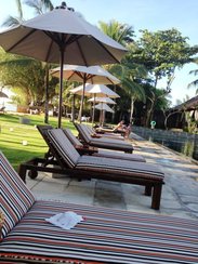 在海边度假酒店的选择上,巴厘岛给游者们提供了非常多的选择,根据你心中的预算在任何地区都能找到适合你的酒店。最热的AYANA也不是没想过,金八兰的洲际也定过,最后全部放弃选择了普瑞度假村。不得不说这里绝对是发呆的好酒店,酒店的规模很小,但是很安静,海滩也打理得非常干净。这家酒店是Oriental Express旗下的巴厘岛两家酒店之一,另一家是乌布空中花园,管理非常有序,工作人员的服务精神非常彻底,管理人员都是老外,服务的都恰到好处。回来之后还收到回访的邮件问我们住的开不开心,有没有什么意见?虽然只是客套的但是能感觉出他们的管理还是比较正规的。 这里的房间都是Villa大概有四十多间,除了Pool Villa外就是园景和海景的了。海景房没有单独的花园,但是无敌的海景是什么都无法比拟的了。不过住过之后我真是庆幸没有定海景房呢,它离海滩最近,园景在海景后排,我更是希望我们离海滩远些。我们住在园景第一排,晚上海浪的声音让我无法入睡,印度洋的海水谁曾想会这般汹涌?确切的说我们这种房型应该叫Cottage,草房???原木的设计让人觉得很亲近大自然。淋浴间在室外,这种设计虽说是private的空间谁敢??我们只有在海边玩完沙子给孩子在这里冲冲。 躺椅上的布艺非常有格调,这酒店白天几乎空荡荡的,总的来说人非常少,难道都在房间里吹空调?那种超大型酒店ayana和洲际我想这种闲暇是难得的吧?再一次为自己的选择得意一番。酒店的海滩非常漂亮,谁说金八兰的海滩过度开发的脏乱不已?至少在Puri Bali你能看到干净的海滩,酒店的躺椅也是非常充足。