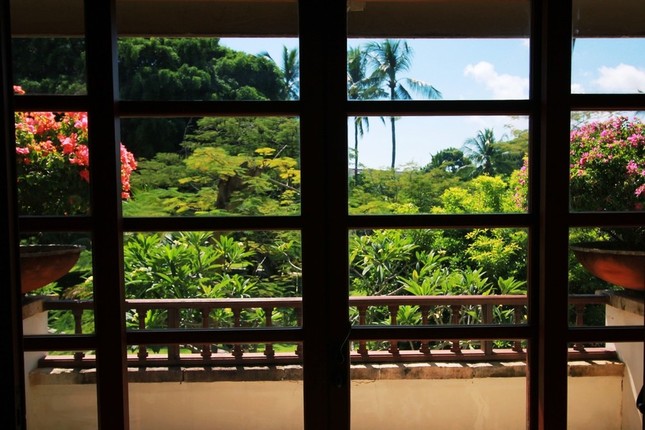 我们住在巴厘岛努沙杜阿海滩Spa酒店,机场过来大约不到一小时。机票和酒店都是两位新人安排的,尽管外面天气很热,但酒店里十分舒服。夜里听得到啄木鸟的叫声,白天会有松鼠光临。 酒店很大,有四个餐厅,换钱比机场值,超市配套设施齐全,可以漫步到海滩,有自己的游泳池。值得一提的是,酒店里的小吧台有各类食品饮料,都可以付费自取,最后退房结算。 这一天的早上,看见一只松鼠趴在阳台。看样子,不知道是在晒太阳,还是讨食物,懒得不行不行的。结果把我们的薯片掰了一点,洒在阳台,退回屋里。它瞬间就精神了,竖着耳朵,跳下来捡起一片,又跑回阴凉下,吃起来。来来回回好几次,身手高超。原来是有经验的老司机,大概吃过不少客人的薯片大餐。