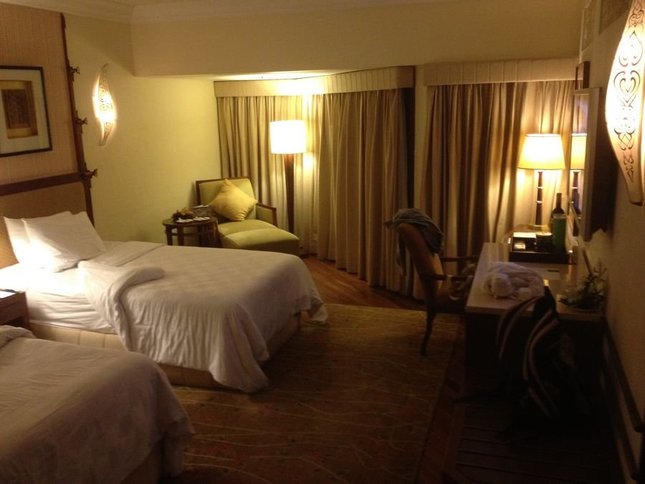 我们的旅行产品是有机场往返接送的。所以出了门就看到CTRIP的牌子,会有司机带我们去酒店,还送了当地的一张sim卡。机场和库塔很近。夜晚也很热闹,特别是大街上,摩托车非常多!司机的中文说得很好,一路上和我们聊天。说我们预定的laguna在nusa dua地区是五星级里面最好的,有私人沙滩,酒店本身也就是个公园……大概半个小时不到,就到laguna酒店啦。当时我们在国内就兑换好了美金,给了司机3美金。 之前在网上看laguna的评价也很多,有人说是中规中矩的五星级啦,说是以前的喜达屋。我们到了之后就先check in,行李什么都会有服务生帮忙送到酒店。当时预定的时候房间就很紧俏,我们是一楼的豪华园景房。出门很方便,步行2分钟就到海滩。欧美人很多,中国人也很多,第二天早上就遇到了一对上海夫妻住在我们边上。
