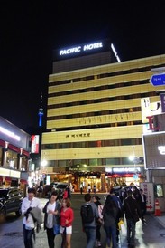 太平洋就住明洞地铁站3号出口上面,属于闹中取静,我窗外刚好有一棵开粉红花的树,然后就是可以直接看到首尔塔,难得的好风景。不过这些都是浮云啦,这里整体给人感觉老旧,毛巾没有弹性,很廉价的感觉,房间好在还算大。住的中国人很多,给人的感觉像中国二三线城市里的假四星酒店。觉得在Agoda它能拿到五颗星简直就是骗人的。好在价格还算过得去,只有不到700块人民币每晚。不过服务当然是很差的啦,前台和door boy几乎听不懂英文。我到的时候房间还在清理,我让他们清理好放上去,结果还是没有照做。前台一个丑女还各种撇嘴,看不起中国人的样子,觉得很失望。