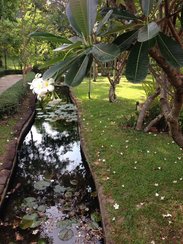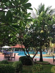 酒店距离机场不远,七八分钟的路程,所以可想而知距离暹粒的酒吧街和老市场不近。好在,酒店定点提供免费去酒吧街的接驳车,只是管去不管回。酒店本身应该提供免费的接机服务,不过送机的话需要支付7刀每人,这个价钱个人觉得还是叫TUTU比较划算,因为以机场到酒店的距离TUTU的话至多5刀搞定。酒店深居在一条道路里,不太适宜喜欢住宿周边有宵夜和闲逛的朋友。 预定的是湖景房,事实上就是对着泳池这一边的房间。虽然之前有被提醒过可能入住的时候酒店会要求信用卡授信,或者有要求支付压金,不过我入住的时候这两样都没有要求。 总体来说酒店环境十分优美,泳池边满是鸡蛋花树还有芒果和椰子…… 值得一提的是酒店的房间和浴室都非常大,提供所以需要的沐浴洗漱用品,包括护发素和身体乳,房间还有附带一个小阳台,不过东南亚蚊虫太多,我这种超级受蚊虫喜爱的体质根本不会去阳台坐着欣赏“湖景”。 房间包含免费早餐,酒店早餐内容丰富包括:中餐、西餐、当地早点和日韩料理。基本上中餐一般都是提供饺子和稀饭,所以完全不用担心吃不惯。推荐酒店里提供的稀饭和煎饺,当地早点黄面也不错。