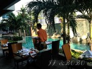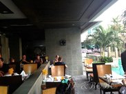 酒店的飘窗可以俯瞰曼谷城区的夜景,层叠的楼宇和高密度的亮化及拥挤的交通都在成为这座东南亚第二大城市名片。酒店的自助早餐品种很丰富,以西式和泰国本土食物为主,餐厅位于酒店中段的楼层,露天的泳池在身边,夏日的气息扑面。