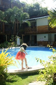 我们住的地方离大街不是很近,所以不像第一家酒店出门就有TUTU车,加上头一天晚上散步已经把方位搞清楚了,所以我们一人拖着一个箱子从Aissatou Beach Resort步行过去了,也就花了10分钟左右。相比之下,这家酒店真的是太热闹了。。。酒店楼下就是一个游泳池,泳池前面就是酒吧,酒店出去十米就是沙滩,住店客人可以享受免费的海滩躺椅。我们住在二楼,坐在房间的阳台可以直接看到大海,无比惬意。。。