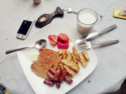 那天到酒店也很晚了,安排的行程是第二天去奇特旺,所以找了家不是很贵的酒店…——KATHMANDU GUEST HOUSE,BOOKING上订的,大概是300多RMB一晚。转天起来用早餐,酒店的早餐,喜欢的全麦吐司、土豆、烤肠、小番茄和牛奶~ 对了,这里要说一下,尼泊尔的所有酒店都是没有拖鞋的,有也是冲凉的那种,不是一次性的,牙刷牙膏不是每个酒店都有,不管你住的多好都一样。(那边酒店的WIFI普遍都很差,真的是很差啊- -经常会断的,哦!还有电!不得不说……特别是加德满都的酒店,半夜基本都会拉电的,只留下应急灯,插座都是没有电的,所以进酒店看清楚用电时间,免得手机、相机充不上电,跳电的确是像很多游记里说的会发生,但是如果你不是去住青旅的,你住的是稍微OK一点的酒店,放心,它只是稍微那么跳一下,隔不了几秒就会好的,供电不足而已。)