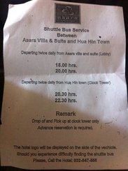 一样的价格,Asara的房间胜在大、舒适、实用。客厅和床都正对泳池,客厅的沙发榻够大,多挤一个人睡完全没问题。阳台也够大,如果是一层的话直接出户就是泳池。浴室也超大,酒店为客人准备了竹编包,方便带物品去海滩。泡澡浴缸一个,淋浴有室内外各有一个。 去之前在网上预约的Asara Spa,2小时的Package3300泰铢/人另外还要加10%服务费和7%税,觉得太贵的话还有其他便宜的项目噢,比如传统泰式按摩等等,官网都有具体价格。当天酒店还有热石按摩的优惠价,记得90分钟是1900泰铢。 酒店18:00有免费的shuttle bus去镇上,停在Clock Tower.后来发现几乎所有的酒店shuttle bus都会停在Clock Tower周边。相比Asara的性价比又明显了些,免费的shuttle bus,免费的wifi,免费的下午茶,免费的书吧。。。 Asara的早餐和Anantara相比要丰富许多,再一次性价比的体现。