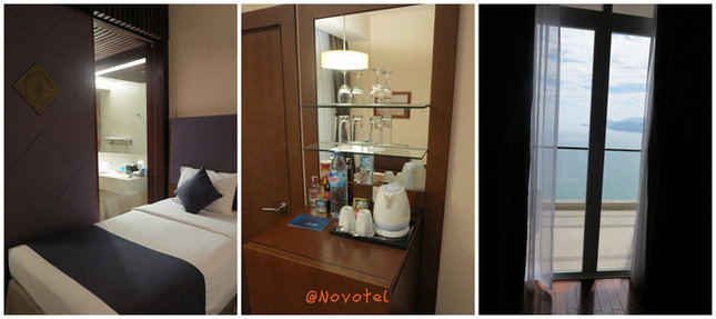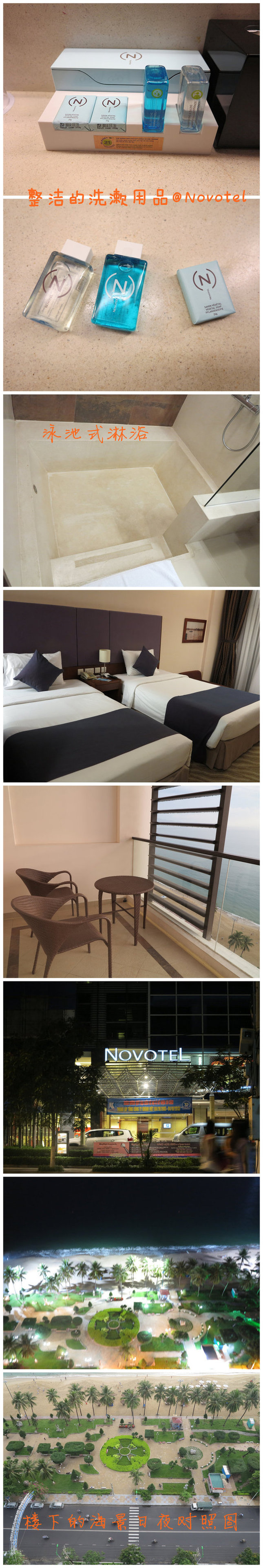 芽庄--novotel nha trang,四星级,3晚286.21美元,折人民币1787元左右,最近美元汇率上去不少,是在酒店官网定的,标房,结果房间是801,房间算比较大,带有阳台,在阳台可以看到马路对面的海景,如果要正面面对海景,每间每晚加23美金,觉得太贵了,没有升级,酒店服务员态度不错,设施蛮新的,早餐品种蛮多的,地理位置不错,往后面走就到新咖啡了。推荐!
