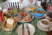 这个酒店地理位置好。旁边就是盘道寺和契迪龙寺,楼下的街道就是周日夜市,离塔佩门也很近,位置极佳。梧桐酒店的早餐环境很好,而且品种丰富,有果汁、切片面包、鸡蛋、香肠、饮料、水果等等,不是自助。