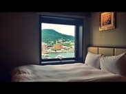 除了自助早餐是我唯一一顿吃到有带刺身的以外(关于la vista,我觉得大家要放低平常心,千万不要神话妖魔化,那样才会有满足感),它的房间设计才是我最喜欢的,那种面朝函馆山和海湾,硕大的玻璃窗,就好勾勒出来一副绝美的画面在眼前。再加上窗周围加边框的设计,让人可以悠哉的坐着靠着床边,或是喝一杯咖啡吃一块蛋糕,或是喝一杯小酒抓两根鱿鱼丝,然后看着端到你面前的窗外风景,何似在人间的飘飘然感也就暖暖的从心底冒了出来。泡完澡后在最高阶的顶层,吃一根棒冰,任窗外再大的飞雪漫舞,你自一身短打浑身冒着热气的痛快到心底,不得不称赞是资本主义的优越性。所以无论你是冲着N0.1的自助早餐,还是无敌风景,亦或是尝试冰天雪地泡澡吃棒冰的快感,la vista应该都不会让你失望的。