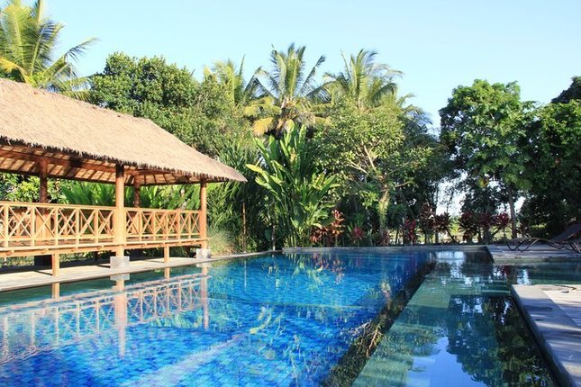 体会:酒店不在乌布的中心,距离乌布皇宫大概有20分钟车程,在一家博物馆的后面;不过好像挺有名的,我们的司机熟门熟路地直接把我们送到了酒店。 前台服务很棒:我当时预定时只订到4个房间,而我们一共有12人,当时想只能加床了;办理入住时问有没有多余的2个房间,结果前台查了下说有而且给我们和原先一样的房价(实际上现场订房的话要55美金,而我原先在网上订的才一半价钱),真是太意外且惊喜了。入住的第二晚我去前台咨询一些事情,结果前台一看到我马上把我的护照交到我手里,此时我没有任何印象护照竞然不在我身边,原来是我办理入住时拿了早餐券啥的就忘记拿护照了,无法想象没有护照我如何回国啊。 酒店服务:酒店有免费的shuttle bus,来往于乌布市场与酒店,需要搭乘的话要与前台预约;每天11点到13点有免费的15分钟的massage,办理入住时会有单子给你;每天15点到16点有免费的下午茶,一些饮料、小点心,咖啡味道不错;只有大堂、餐厅、游泳池有wifi,房间是没有的,连自己的移动wifi信号也不好,就楼上楼下都收不到。