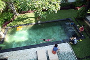 巴厘岛一流的酒店,二流的海滩,三流的景点绝对不是瞎说,选酒店的时候选花眼,努沙杜瓦的海滩最好,但酒店最贵,一溜五星级,住标间还可以,但几家一起住带泳池的别墅住不起。偏僻点的地方泳池别墅很便宜,但还想兼顾海滩。最后选的这家达姆帕缇别墅酒店(Dampati Villas)在沙努尔,不是很热闹的地方,全别墅套房,三卧室带泳池的每晚1600不到,含早,距海滩步行3分钟,周围有小市场和饭馆。除了海滩不是特别干净其他没什么缺点,尤其是泳池,大人孩子都特满意,太省心了。