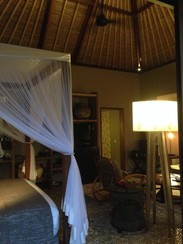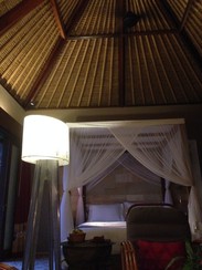 这里其实是一段villa惊喜之旅的开始。这家非常隐蔽,无论是我们的司机还是漂流的司机,都花了很长时间来找这家酒店。它藏身于一个村落中,外表看起来,感觉就是在两户人家的隔壁一样。但是里面真的可以用曲径通幽来形容。我们第一天因为到的很晚,酒店离乌布中心又有一定距离,就尝试了酒店厨师做的印尼当地晚餐。后来发现,印尼的饭菜并没有像论坛里同学们形容的非常难吃。也正是这家酒店的厨师给了我的美食体验一个美好的起点。 我们定的villa进去之后才发现房间真是无比的大,因为酒店所有服务都可以免费送到房间里。所有住的头两天,我们一直以为酒店就只有我们两个人入住,只在路过大堂的时候偶尔看到几个客人。私密性真的很赞! 要说住在这里唯一的缺点,就是离中心比较远,对于喜爱看景点,喜爱吃感受人潮汹涌的人来说,未免会失望很多。