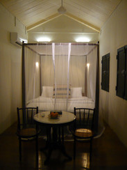 酒店位于乔治城的中心位置。从槟城机场坐401e公交车到终点站光大中心,步行15分钟左右可以到达酒店。酒店所在道路的中文名叫“南华医院街”,但南华医院不在这条街上。酒店旁边就是天后宫,离蓝屋的步行距离是5分钟。酒店附近有个红园red garden(蓝屋边上)是夜排档,营业时间晚上6点到半夜3点。 酒店早年是一间马房,上层住车夫,下层养马匹,当时槟城达官贵人出门习惯坐马车。4年前一位退休的银行家落叶归根,收购了这里并改造成有9间套房的酒店。酒店的门口有一个mini的Café,提供接待和餐饮。房间内绝大部家具都是古董真品,酒店还意外地将我们升级为king套房,挑高的楼层、迷人的帷幔…一切一切都非常完美,造成到了槟城后,除了购物,任何的景点、美食对于大家都缺少吸引力,在酒店的角落找个好位置来上网,变成槟城最大的乐趣。