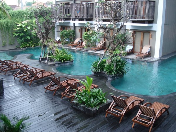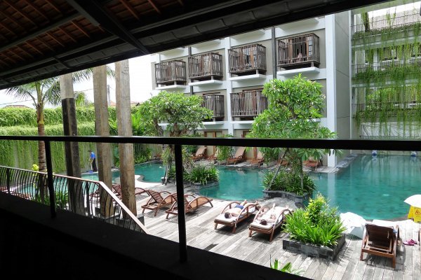 房间很大而且阳台很有特色,在阳台上有小桌子坐着喝东西还可以直接欣赏泳池的景色。这个酒店在海滩上是有自己的沙滩俱乐部的,所以到了以后,报了房间号,人家就给提供免费的毛巾和躺椅。酒店旁边挨着就是一个大超市。早点很好吃,有印尼特色的食品,比如炒饭炒菜什么的。也有西餐的面包奶酪等。