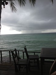 帕岸是一个更小的岛,岛上人也不多。因为订的酒店的位置太远,住的时间又太短,酒店不提供接送服务,来回的车费就花了200B每人。度假村靠近一片小小的海滩,虽说这个度假村也是独栋木屋小别墅,可是和前面在苏梅岛住的Montien House Hotel比起来差远了,连被子都没有提供只有薄薄的一个床单。蚊虫超级多,晚上必须开空调才能幸免,但是空调开了又很冷,从国内来的时候穿的厚衣服派上了用场,全部从箱子里拉出来搭在身上。第二天早上又下起了雨,去酒店餐厅吃早饭才发现,原来昨天那片小小的海滩已经被潮水淹没,变成了这个样子。远处那团黑黑的就是正在下雨的地方(见照片)。