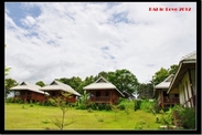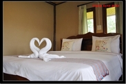 一个属于田园与自然的旅馆,在一片绿意盎然的草坡上,建了5栋小木屋,每一栋就只有1间房,还带一个小阳台。WIANG KUM PAI的小木屋,这2晚一共1554B,折合才一百多人民币一晚,简直超划算。屋前是一片视野开阔的田园风光,我们到达的时候,旁边的田野上还在烧稻草吧!好村味哦!房间有张大大舒服的床,床靠还是个古式的柜子,放东西很方便。床上用毛巾折了一对亲吻的天鹅,很有爱哦!