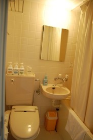 入住妥当,开始观察榻榻米房间。有一台很小的电视机,没有国际频道,只有本国频道。(之后的酒店也是一样)有保险箱、冰箱、可保温的烧水壶、迷你衣架供晾衣服。阳台被封了起来,用几扇移门挡住。桌子上还有喝茶的碗碟。卫生间超级迷你,不提供毛巾和一次性用品,沐浴露之类的齐全。冷水龙头上的出水都是直饮水,也就是国内的纯净水,我特别看了一下烧水壶,没有一点水垢,内壁锃亮。 早上在规定的时间段去吃早餐,跟前台的老头询问了半天早餐问题,最后像捡了大便宜一样。事情是这样滴,预订单上标明的是不含早餐的,入住的时候前台给了每个房间一张早餐卡,写了就餐时间等等信息,我们以为一个房间就赠送一份早餐,于是向前台询问。结果说了半天,老头也没搞懂,他以为我们少拿了就餐卡问他再要,于是又拿了两张给我们。直到我们去吃早饭时也没人问我们要卡,也就是说只要是住他们的酒店就可以去免费吃早餐。这下可乐坏我们了,又省了一笔开销啊。早餐品种很丰富啊,又是咖喱饭又是西式面包奶酪的。不知道为啥,岛国电饭锅煮出来的饭就是香,贝同学因此连吃了两盘,还偷偷摸摸的,生怕丢了国人的脸,以为我们都是饿死鬼投胎,没吃过米饭。