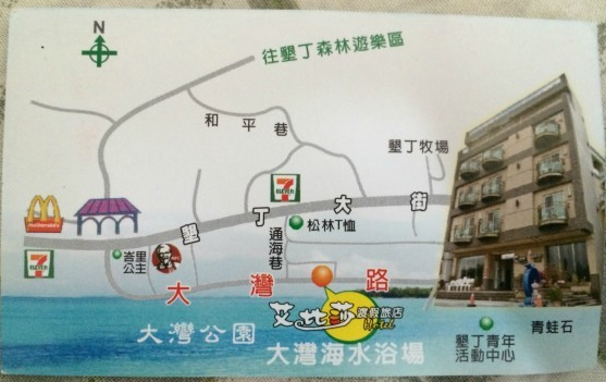 大家千万仔细看好酒店位置,许多写着垦丁大街的民宿都离垦丁很远,大家一定得看酒店位置地图!由于此次旅行随心性很大,所以只预定了垦丁两天的民宿:垦丁艾比莎度假酒店(在与垦丁大街相邻的大湾路上,事实证明住宿在大湾路上是明智的选择,远离垦丁大街的喧闹,临海,从通海巷步行到垦丁大街只需2分钟,大湾路全长不过一站地)艾比莎的海景家庭房2100台币,房间内有两张双人床,电视,沙发,独立卫生间,阳台。从阳台望出去就是大湾的海滩,步行到海滩只需2分钟。