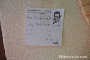我们住的第一间GH叫做 Tri Gong. 850b/间。这家店不包早餐。 我们到的时候,接待的已经下班了,我们只能打电话叫人。这些GH 一般都管理比较严格,这间GH 进去有两道门,才能到房间,所以绝对保障了游客的安全。因为太晚到了,接待的人根本就没要我们的passport,说第二天再给他就可以了, 这是对人的一种信任。要是搁在中国,恐怕不行了吧.....由于是3个人,所以走到哪我第一个问的是 能不能3个人住或者是 能不能加床..... 后来,当我们离开trigong去另外一家旅馆时,,看见之前trigong 店家留的纸条,觉得好温馨!咔嚓下来留作纪念!