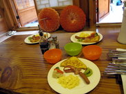 说实话,我看到这个院子的时候心里稍微有点凉。之前看网站的图片觉得应该跟四合院差不多,事实上非常小。但也不能算人家false advertising,人家说了有院子,又没说院子多大。因为房屋结构的限制,传统韩屋的房间一般只有三到四间,能够接纳的客人有限,旺季的时候可要赶快下手。我们的房间SAN,韩文里乃山的意思,是3间客房里最大的一间,房间里没什么家具,这样也好,不占空间。值得注意的是,10月的首尔还是有蚊子,韩屋里面更是不少。韩式的地铺Ondol。看介绍说这房间能住4-5人,可是我们感觉铺了三张床就满了,难道是我们不会铺床?之前担心妈睡地铺会不习惯,为了保障妈睡眠,让老板又加了垫子,结结实实、厚厚软软的两层,没想到比睡床还舒服。这家民宿提供简单的美式早餐,每天的内容都不一样。第一天是老板娘做的,超级好吃的三明治配牛奶。早餐台麻雀虽小,五脏俱全。咖啡、茶、麦片一样不少。