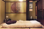 一间很传统的三层日式民房。乐座就在祗园,到哪里都很方便,都可以用走的,而且旁边就是鸭川,白天夜晚的景色都很美。房间里还有小花瓶和字画。而且窗户上也做了竹子的图案,晚上关灯之后外面的灯光透过窗户照进来,就会看到竹子的影子。梳妆柜里放了两颗松果~衣柜里摆着铺榻榻米的东西,上面还附了一张说明,照着来铺很快就完成了。原来以为榻榻米只是一张普通的床垫,想不到铺起来还有点复杂,不过亲手铺一次真的挺好玩的~