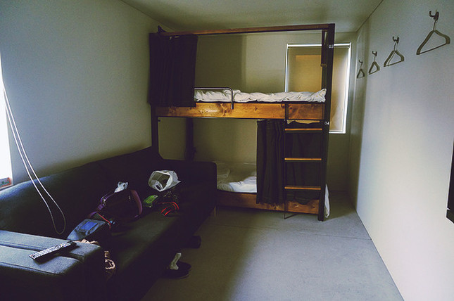 这间旅舍距离京都站八条口只有5分钟左右的步行路程,藏在一条小巷子里,门口有个社区停车场,四通八达。旅舍的极简风格,无论从酒店外观和内部空间上都得到了很好的运用,一楼的室内公共区域集中了前台、客厅、酒吧、厨房、淋浴间等设施,二楼以上是客房,有电梯乘坐。 我们一家人住在四人间,房间两头各有一张上下铺,除此之外还有两张沙发,空间足够宽敞。白水泥地面是一个很棒的选择,真想以后自己的工作室也这么设计,不过这也就是在日本,LZ黑色鞋底走了一星期,连灰都没沾上......洗漱台和厕所是公用的,打开房门就在对面。 日本的床垫都是记忆海绵,我觉得太软不好翻身,但爸妈和外婆一致认为很贴合腰背,回国以后速度把家里床垫和枕头进行大换血。