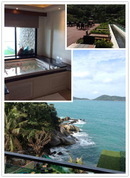 这是在普吉住最后一晚住的酒店,五星级,里面真的好舒服,很适合度假,很美很美,只可惜我们享受的时间太少了~进去服务特别好,给我们准备了小蛋糕,还会让你选香皂的味道,选枕头的类型!超赞~房间带有浴缸,可以泡澡解除一天疲劳!一晚海景房,人民币加税后是621.6,带早餐,早餐也超级棒!有各种果汁,水果等等美味~真是美食加美景啊!从我们的房间看去,就是湛蓝色的大海!(如下图)有的更贵的房间还带私人泳池……我们能看见,除了羡慕还是羡慕啊!酒店还自有一片沙滩~总之太适合度假了!