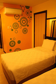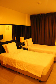 当看到Robinsons(罗宾迅超市),意味着就快要到了,gohotels就在超市前。标志性的黄绿建筑,格外的醒目抢眼。 酒店的大堂明亮宽敞,双人大床房在进门的右手面,双床标间房在进门方向的左手面。朋友因比我们迟订,只能以588P(税前)的价格订到房,我订的时候是388P(税前)一间/晚,折回人民币才六十多一晚,两间房130人仔也不用,去哪找这么便宜的呢,很豪气地订了一房双床,一间大床房,三个人也可以住得舒服一些。l办理check in考虑到另一个朋友会加入跟咱们拼房,就跟服务员商量把大床房改成双床房,服务员查过有空房后就同意给咱们换了。 跟着帮我们搬行李的小黑进房去,不得不赞扬一下小黑们的敬业精神,小黑一人拖咱们两行李箱,进房还先帮咱们把房卡插好,开了空调,确认各样设备没问题才退出去,这样的服务态度连五星级的大酒店也未必有吧?而且房间,真心的32个赞,这次挣大了。^-^