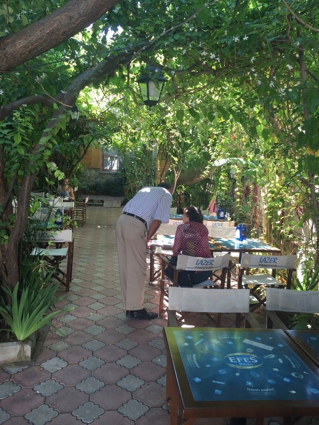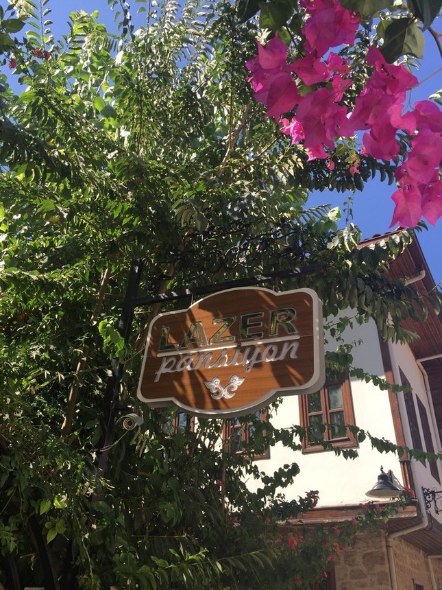 在格雷梅镇住的是Travellers' Cave Hotel,65欧每晚。注意是Hotel, 不是Pension。Travellers' Cave Pension就是另外一家背包客的旅馆了。我们住的旅馆在格雷梅镇边上的小山坡上,我们的房间几乎在最上面,可以俯看整个小镇和周边的风景。每天早上6点半到7点会有50多个热气球从我们头顶近距离飞过,非常壮观。房间是石头彻的,很有洞穴的感觉。山区温差大,晚上有暖气,不怕冷。从酒店到小镇有捷径可走,很近。带着行李的话,打个电话酒店会免费来接。另外,酒店推荐的一日游和气球游都很好,钱统一在结帐的时候付给酒店,十分方便。一日游是Hiro Travel Agent的,热气球是Butterfly公司的。大概因为我们住了四晚,结帐时店主还送了一瓶当地产的卡巴多西亚的红酒,后来我们知道这酒在土耳其还挺有名的。
