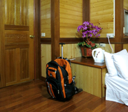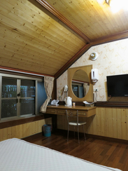 那位传说中的蜜蜜阿嬷带我们上了三楼。楼梯干净得我都不忍穿外面的鞋子下脚。订的双人间,她给了我们个4人间,进去要换拖鞋。小木屋,很温馨哦!