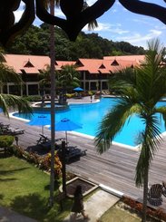 LAGUNA的服务还不错,登嘉楼机场下来直接上大巴,送到JETTY,买5RM的海洋公园门票上船出发就到了···回来如果你是晚上的飞机,他还能把你拖到登嘉楼唐人街让你逛2-3个小时··哦,也要买5RM的附加票··嘿嘿。当然了,laguna属于性价比选项,风景凑合,就是人多··· 住:酒店主要分为3种类型的房间:1)池景/山景房:说白了就是房间不怎么看得到海的房间,相对比较好的是围绕游泳池一圈的池景房,山景就比较差了····2)海景房:就是面朝大海的房间,坐在阳台上可以看得到主海滩的···3)高档海景房:就是正面对海,并且阳台比普通海景房大一倍那种····· 由于laguna这里是一天的客人一起接上岛的···所以建议大家不要怕麻烦,尽早排队CHECK IN,我就是因为懒,拿得最后一个房间,结果拿了最烂的一个海景房,5555555另外么,laguna的房间挺好玩,除了一个大床,居然还有2个小床贴墙····我和媳妇说,难道是知道我打呼,给的备用床?哈哈····· 吃:吃是laguna这里最美特色的事情了,每顿饭都是在LOBBY 2楼吃自助餐·····当然是免费的(含在3D2N套餐中的)东西么,凑合凑合,有一个油炸档,一个烧烤档每次东西还不错,其他东西都是大路货····水果一般就是西瓜,木瓜和菠萝···么的特色····饕客就表指望了LAGUNA的吃了···并且很令人发指的是,你就是想掏钱吃,也吃不到···因为没有卖的····嘿嘿·· 玩:娱乐项目对3D2N还是比较丰富的····每天上午下午各有一次免费的出海浮潜,分OPEN SEA, MARINE PARK 两块地方····另外感觉比较有意思的是射箭,丛林hiking,还要交是所有海岛都有的深潜··晚上酒店会组织类似歌舞晚会的东西,就是唱唱跳跳···一般能持续到10-11点······
