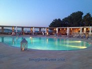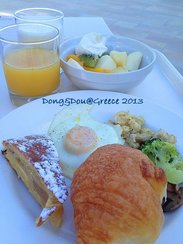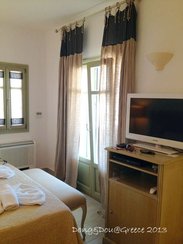 酒店在小岛的北边离纳乌萨小镇比较近,酒店不提供免费接送,15欧/次。后来电话要求接船,但回复没车,只能自己找去了。从码头开车到酒店一条直路看到大海左拐就到,还算比较好找。酒店有免费停车场,进去就是游泳池和前台,客房是两层楼的小房子,楼梯都是用那里的特产白色大理石做的,房间看上去干净简洁,但是不大,有个小阳台看不到海。前台同样热情,房间里没有热水壶,本来想借一个,结果他们直接送了开水过来。