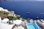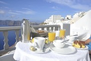 Oia: Filotera Villas 160欧/晚 *1晚。这家酒店是在tripadivors 的排名上找的,booking没有,邮件过去直接给了官网上的淡季价。Oia悬崖上的海景洞穴屋,这个价钱算是谈到的最低价了。 就在小镇入口的石板路上,是父子俩经营的家庭旅馆。老板给了我们最顶的房间,房间顶与大路平齐,旁边有很大的私家露台,唯一不足的是离主路太近,就是偶尔有点吵杂,也有很多游客往下拍照什么的(虽然有棚子遮住不一定能看到)。房间不大,但设施一应俱全,很传统的洞穴房,有厨房有浴缸有音响,房间门双层,可以隔着玻璃吹着空调看蓝蓝的爱琴海。酒店最低层还有泳池和按摩浴缸,有老外看着海一天泡到晚,可惜我们没去泡泡。入住送自家酿葡萄酒和水果一篮,早餐比小世界差一点吧。总的来说,还是相当满意的,向各位想体验Oia传统洞穴屋的同学们推荐! 依然是希腊传统早餐,这次换成蛋糕+鸡蛋+老酸奶+水果,足够支撑大半天的能量。在露台看着爱琴海吃早餐,圣岛不可错过的一大享受也~~~